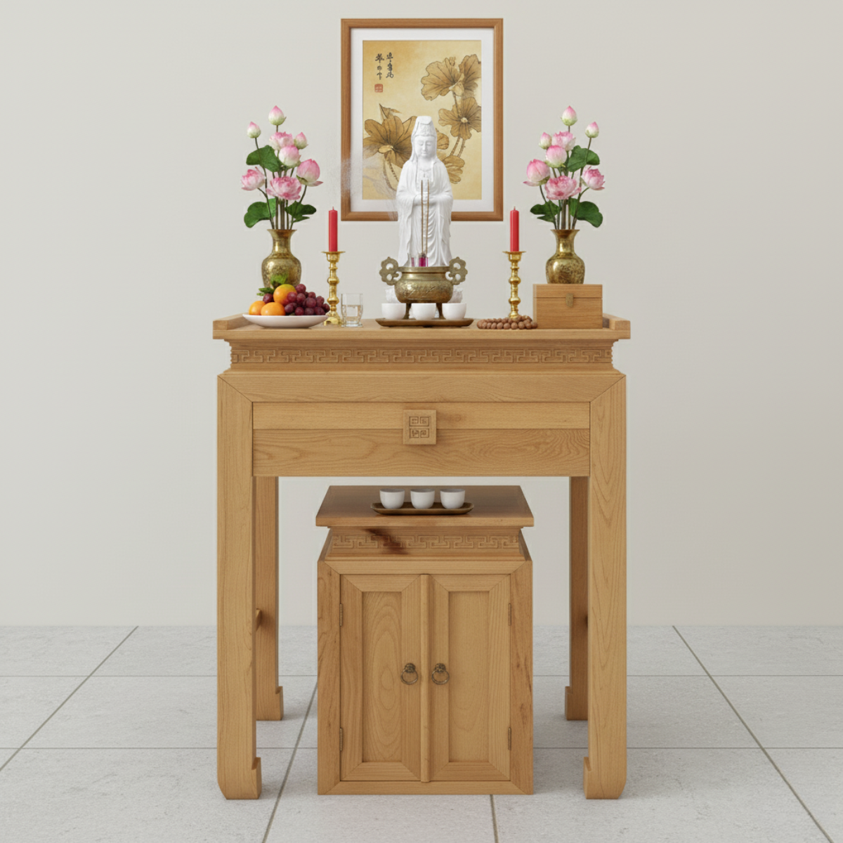 Tích Hợp Tủ Cơm/Đôn Thờ: Tủ nhỏ có cánh tủ đặt bên dưới bàn thờ chính (có thể tháo rời hoặc đặt lồng), tạo không gian kín đáo để lưu trữ đồ cúng, vàng mã hoặc sử dụng làm bàn cơm phụ khi cần.