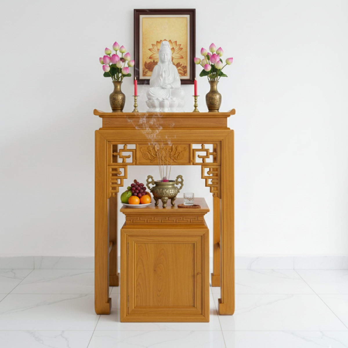 Đôn Tủ Đa Năng: Đôn tủ không chỉ là nơi đặt mâm cúng phụ mà còn có cánh tủ mở (như trong hình) để lưu trữ đồ cúng, vàng mã một cách kín đáo, giữ cho khu vực thờ cúng luôn sạch sẽ và gọn gàng.