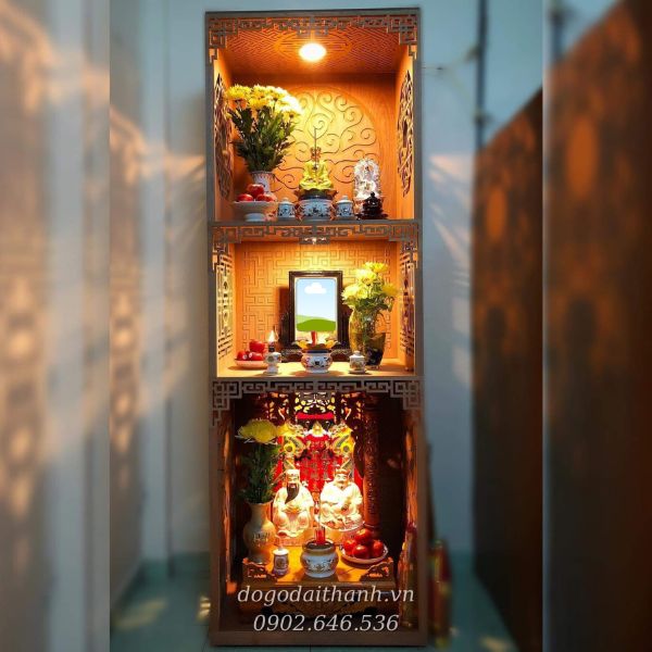 - Mẫu bàn thờ gia tiên đẹp, tủ thờ, bàn thờ đứng, sập thờ, Bàn thờ gỗ 2 tầng, bàn thờ 3 tầng thờ ông bà tổ tiên được làm từ các loại gỗ khác nhau như gỗ muồng, gỗ sồi, gỗ căm xe, gỗ gõ đỏ,.. được chọn lọc kỹ lưỡng thể hiện sự trang nghiêm, thanh tịnh của bàn thờ gia tiên.